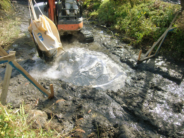 当初、池の護岸整備工事の工法は張ブロック工であった。経済性、周辺環境等を比較検討の結果、経済性が高く、又、池の堤体全体をセメント改良工を行うことで防草効果を確保出来るKR工法(本設構造物のKRB工法)が採用された。