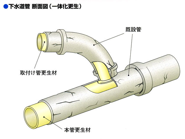 - 下水道管きょ(取付管と本管接合部を含む)を一体化更生する事ができる。