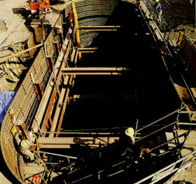 - 各種実用実験を基に外圧に十分耐え得る部材で構成されています。また、施工に当っては、バックホーで各部材を押し込み、掘削をしながら沈下させて行く方法によるので常に安全な構内作業スペースの確保ができます。